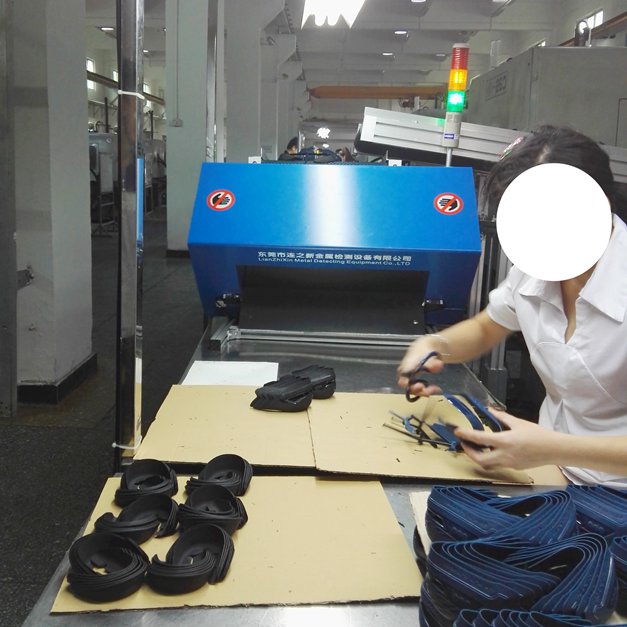 该鞋厂检针机使用现场是东莞高埗某台资鞋厂,该厂专门生产鞋后帮类塑胶产品。采用注塑机后滑道式检针机进行金属异物检测,检针能力:FE1.0mm