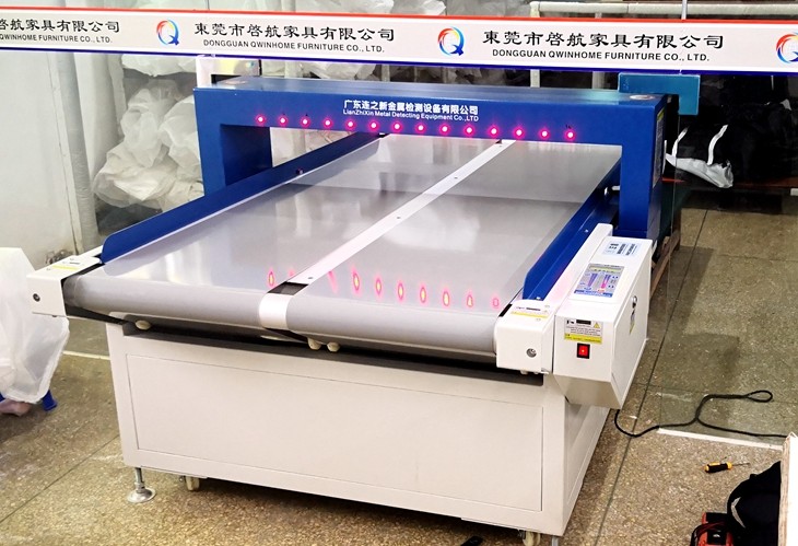 启航家具沙发皮革皮套检针机使用现场。皮革等大件沙发包皮通常具有金属元素效应,普通检针机通常无法胜任。连之新1米宽幅沙发皮套检针机专为启航家具定制,机器长度2米,检测宽度1米,检测高度25厘米。可检测1.5mm铁!