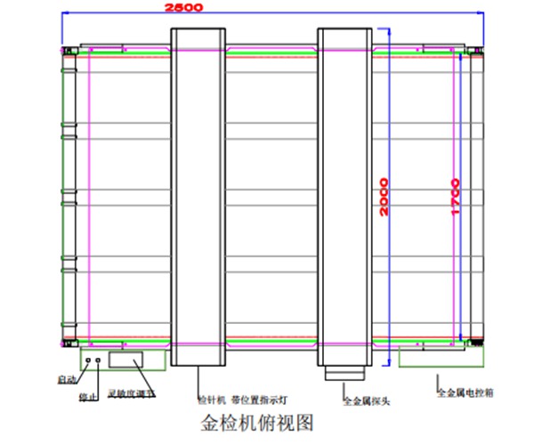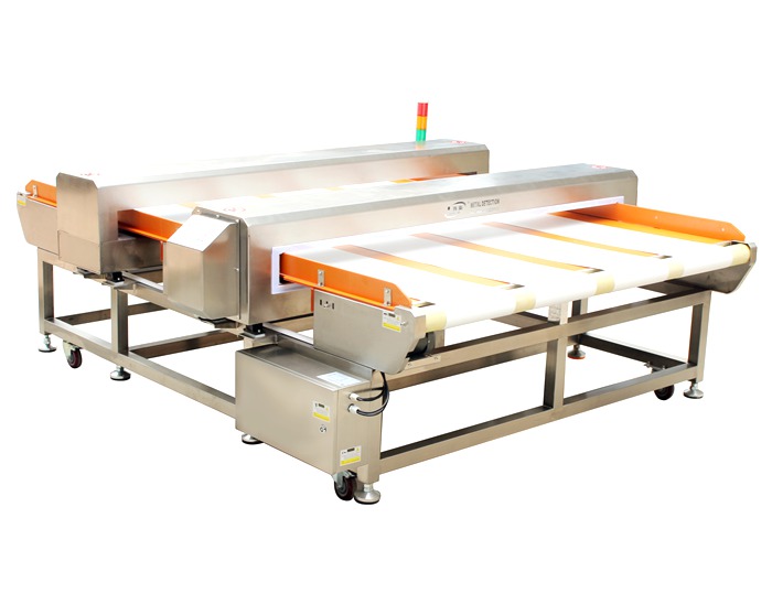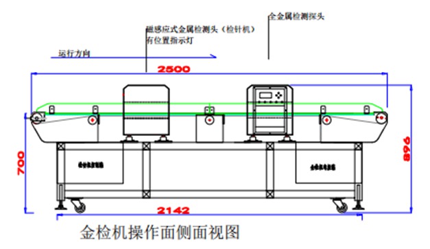 是一台客户定制的双系统探测型数字式金属检测机,整机采用304不锈钢设计制作,并且前探头采用传统检针机制作有位置指示灯功能,第二组探头为全金属检测机系统,可检测出细小的铁、铜、铝、不锈钢等所有金属异物。