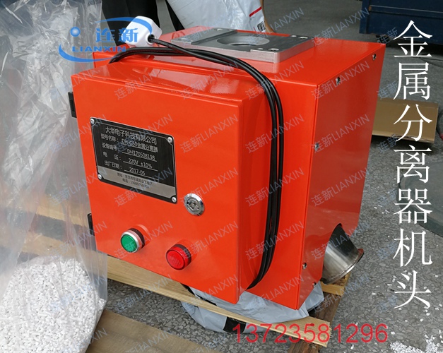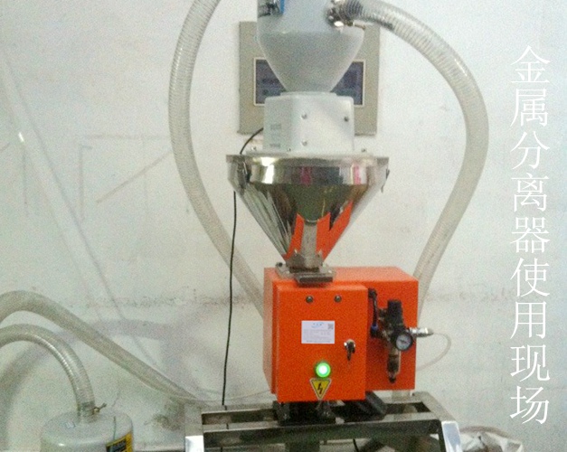 原料从料斗或送料器自由下落进入金属分离器,如果没有金属杂质,原料会直接通过金属分离器流向下端的出料口。如果检测器检测到原料中含有金属,那么控制器立刻启动分离板将金属物和部分原料一起导向侧面的排料口,然后分流板迅速恢复至正常的位置,分流板速度可调,金属分离器的检测精度也可根据生产需要调节,最小可检测并分离出Φ 0.2mm的金属颗粒。